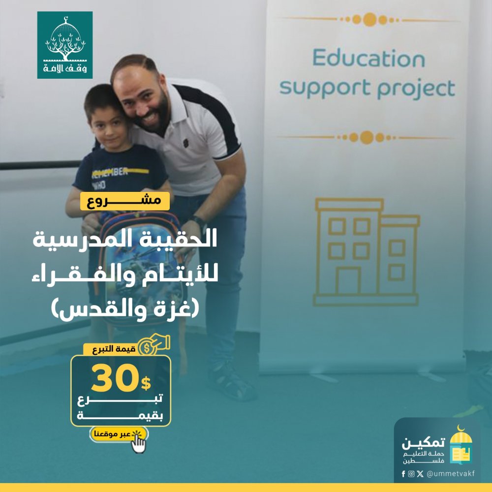 في القدس نهدف من خلال مشروع الحقيبة المدرسية مشروع نخدم به طلاب العلم من أهل القدس ونخفف الحمل عن الأسر المتعففة والأيتام، والذي يحرص الوقف على تنفيذه مع بداية كل عام دراسي. فالحقيبة المدرسية مع بساطتها إلا أنها تقف عائقاً أمام الكثير من الأهالي وتحرم أطفالهم من حقهم في التعليم!!