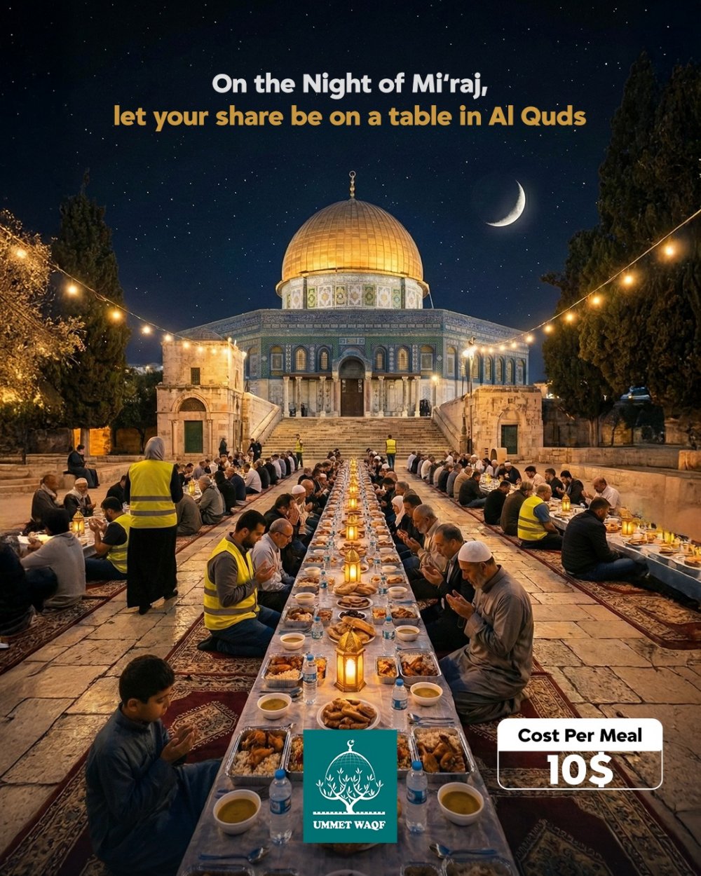 On this blessed Night of Mi‘raj, take part in the meal distribution we are carrying out at Al-Aqsa Mosque. Let your contribution be a plate on the tables set for worshippers and those in need.