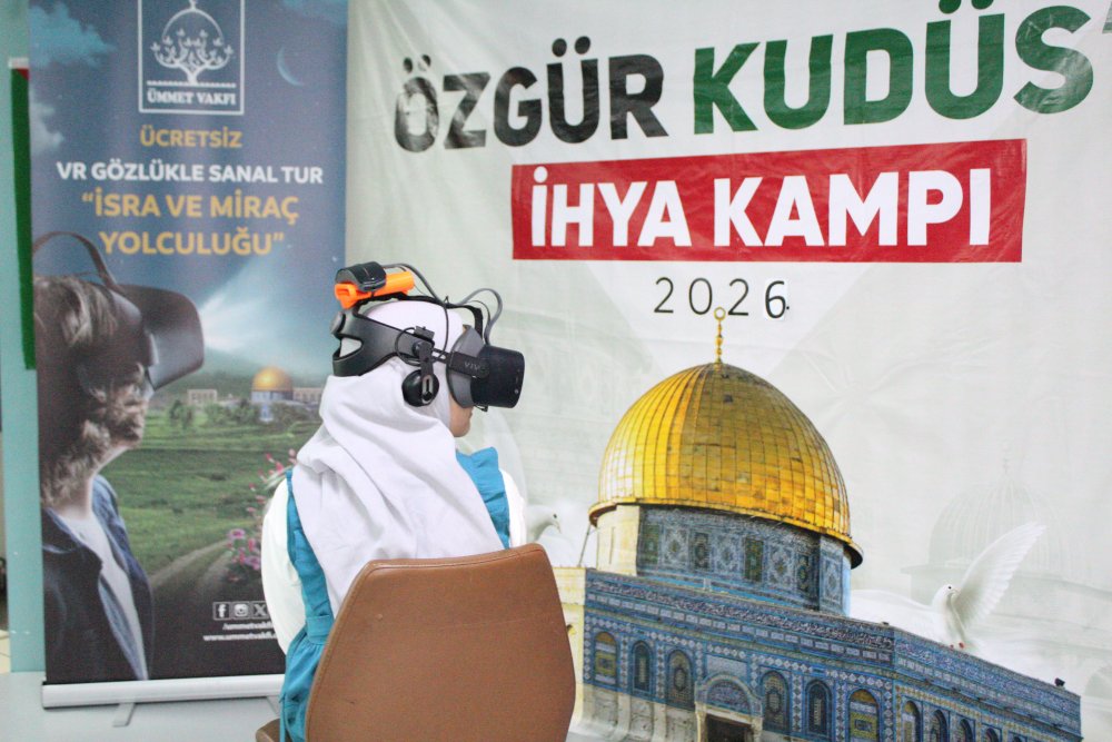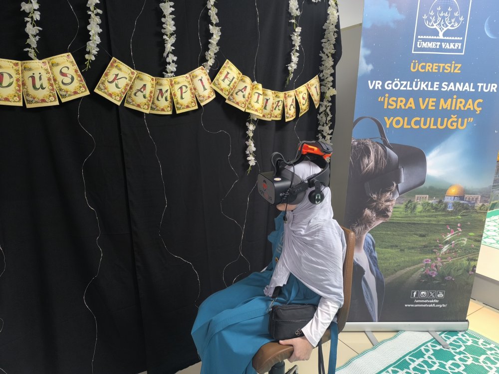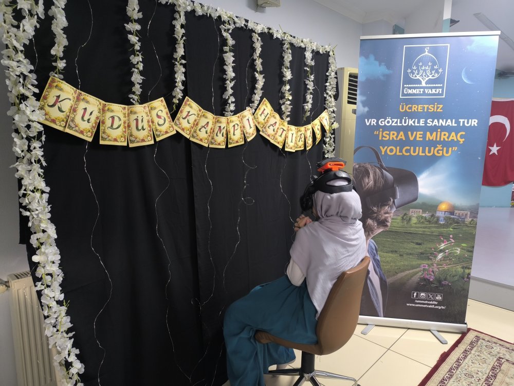 “İhya Vakfı’na bağlı Sümbül Valide Kız Kur’an Kursu’nda düzenlenen Kudüs Kampı programı kapsamında, öğrenciler Ümmet Vakfı iş birliğiyle iki gün boyunca VR gözlük aracılığıyla İsra ve Miraç mucizesini deneyimledi.”