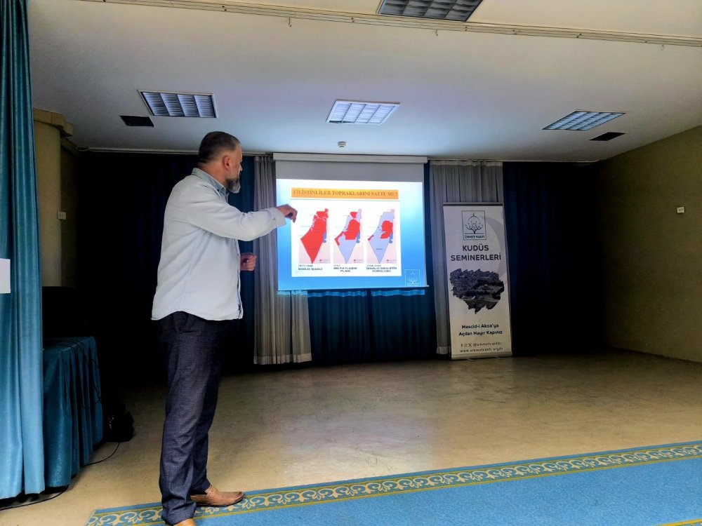 Sunumun ilerleyen kısmında halkımızda var olan Kudüs sevgisinin doğru bilgi ve farkındalıkla güçlendirilmesi gerektiğine dikkat çeken Yazıcılar, işgalci İsrail’in Filistin halkını topraklarından zorla göç ettirdiğini vurguladı.