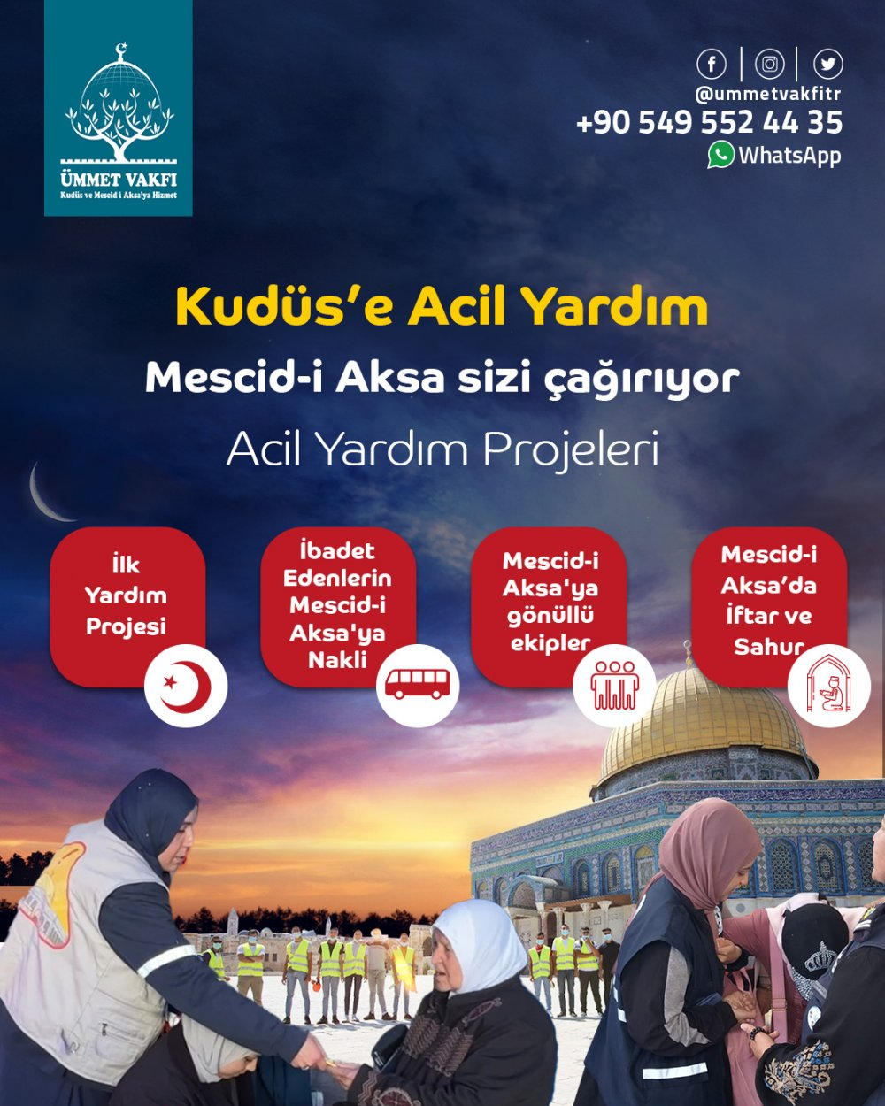 Ümmet Vakfı olarak, Mescid-i Aksa ve Kudüs halkı için yürüttüÄŸümüz bu projelerle hem bölgedeki ihtiyaç sahiplerine destek olmayı hedefliyor hem de Mescid-i Aksa’yı yalnız bırakmıyoruz.